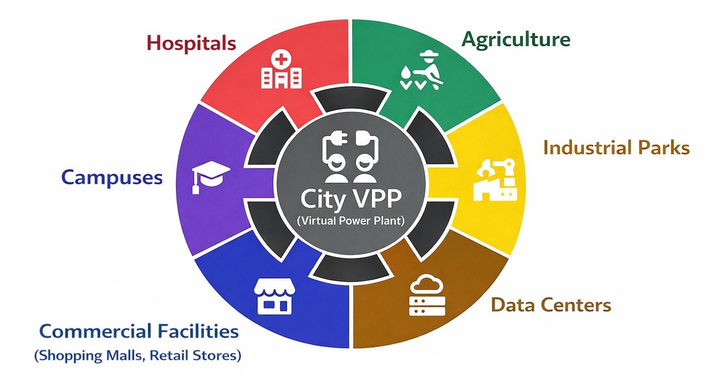 City-scale VPP solutions across commercial facilities, industrial parks, agriculture, campuses, hospitals, and data centers
